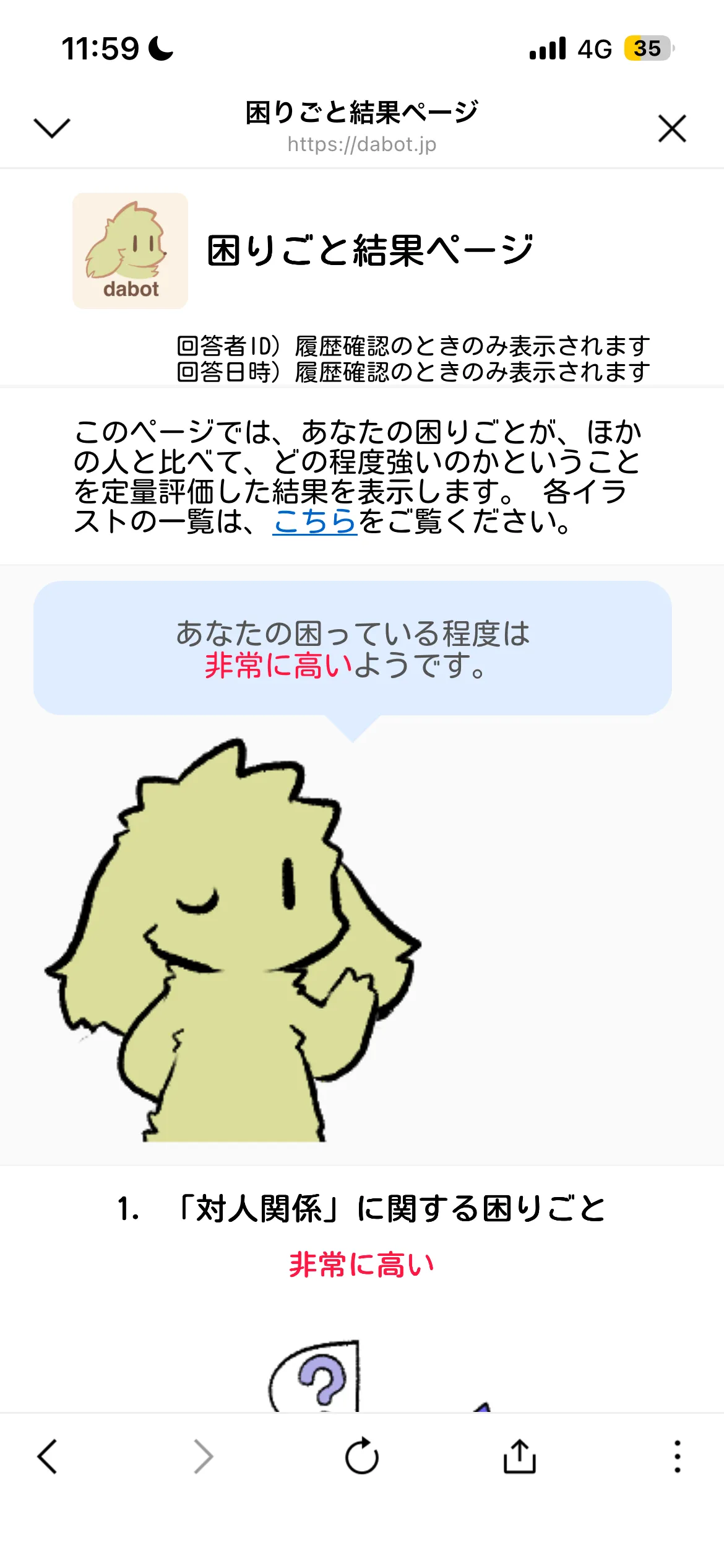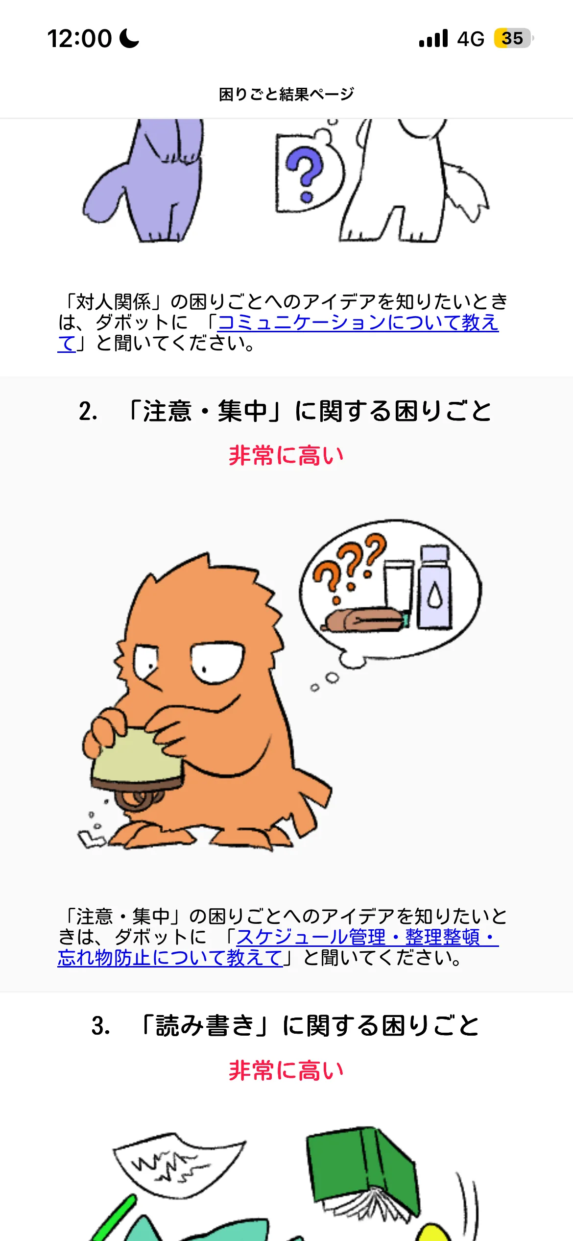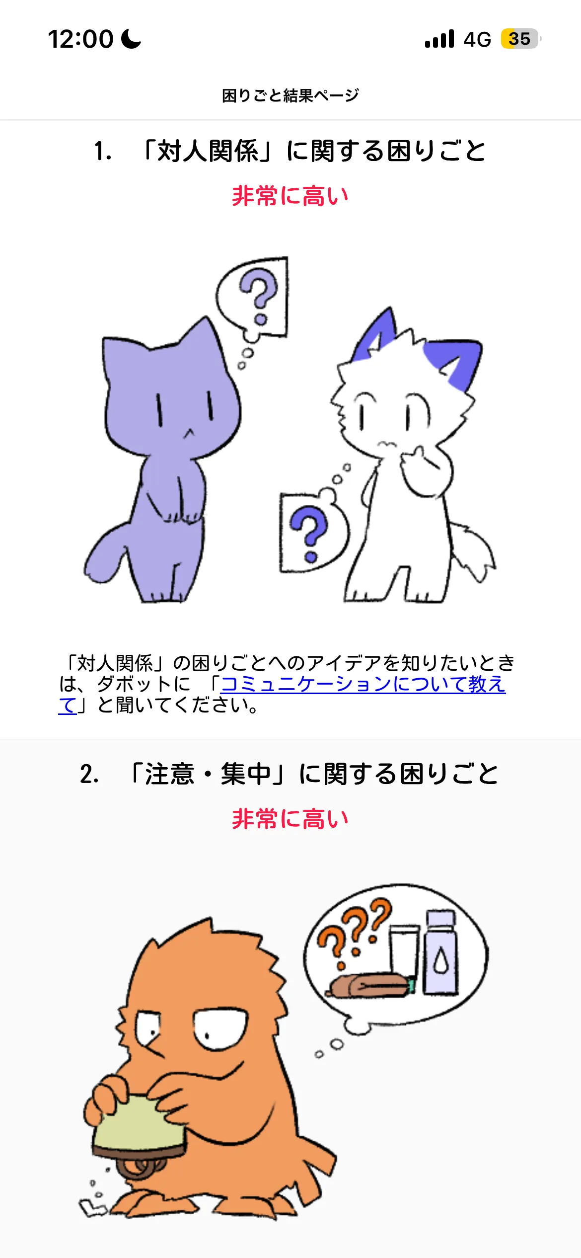 自分は他の人と比べて、何に・どの程度困っているのだろうか…と考えたことはありませんか?ダボットを使えば、33項目の簡単な質問に答えるだけで、あなたの困りごとをセルフチェックすることができます。