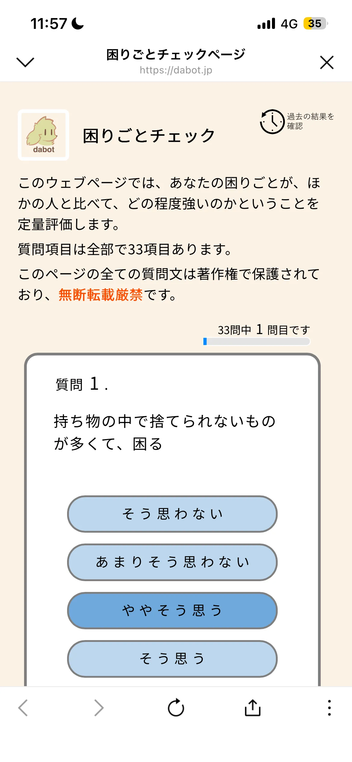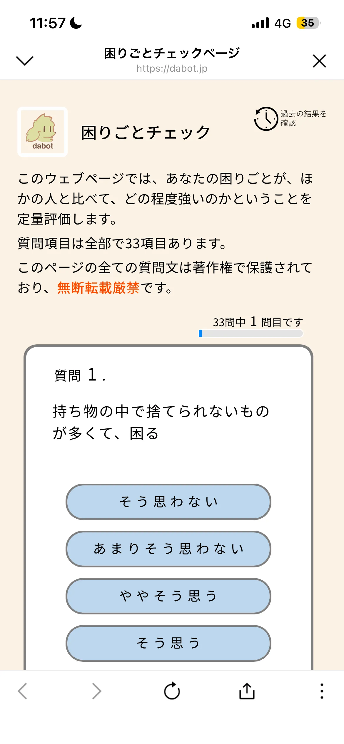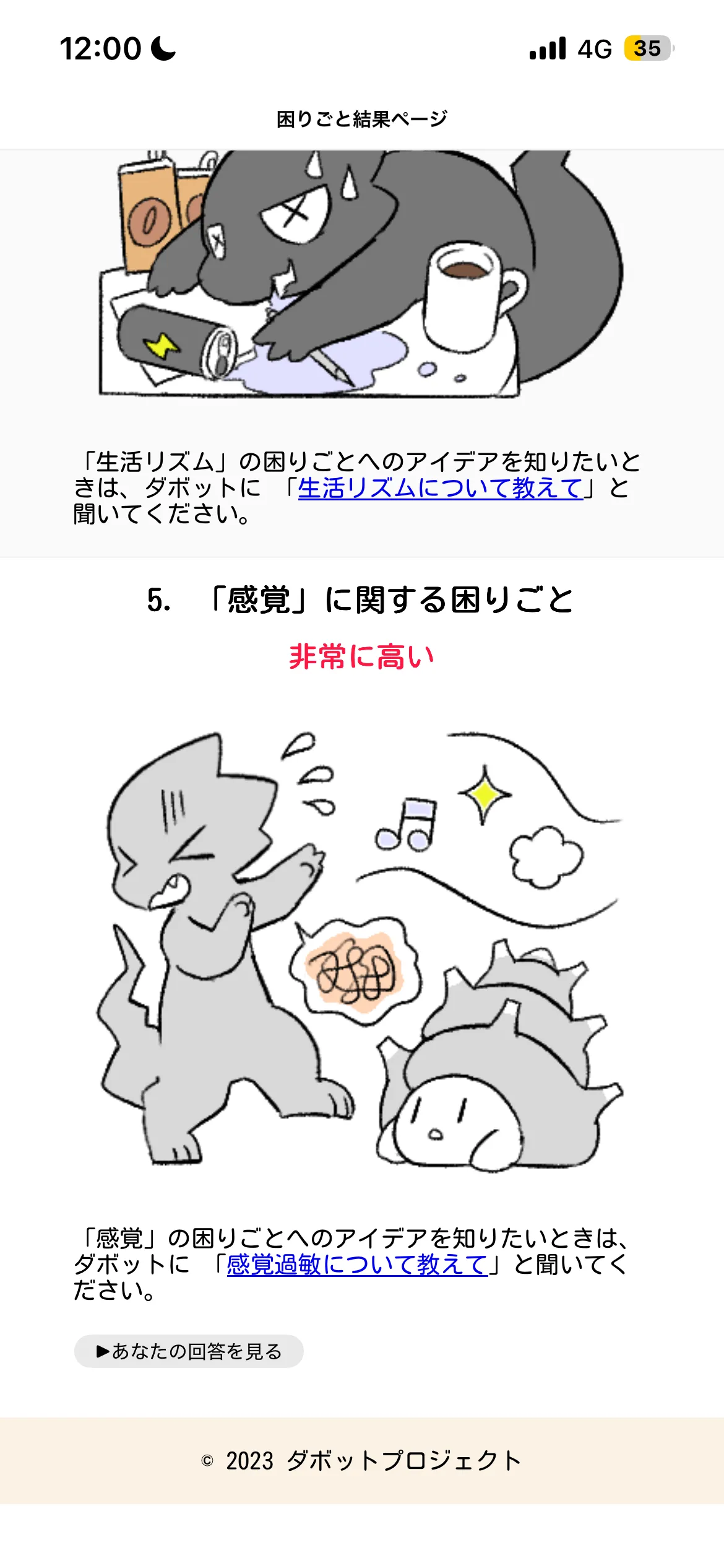 自分は他の人と比べて、何に・どの程度困っているのだろうか…と考えたことはありませんか?ダボットを使えば、33項目の簡単な質問に答えるだけで、あなたの困りごとをセルフチェックすることができます。