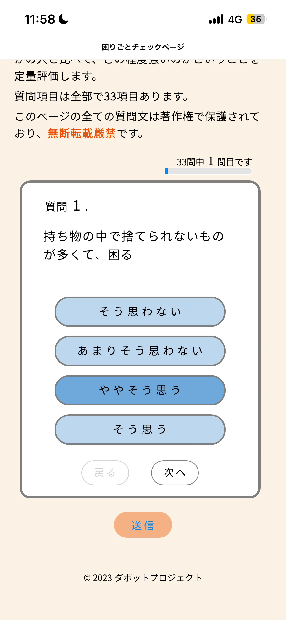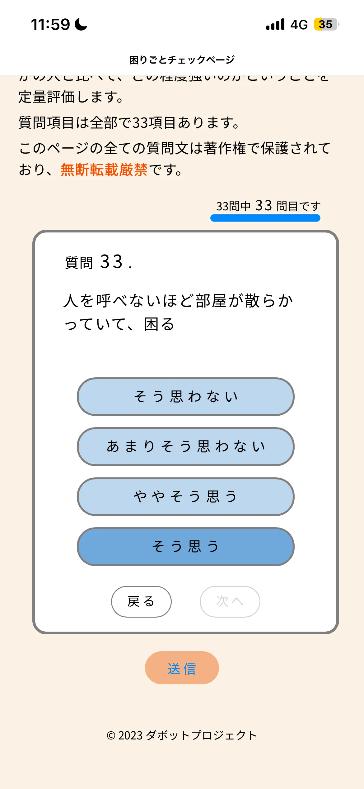 質問は全部で33問あります。すべての質問に回答し終えるまで、これを繰り返してください。