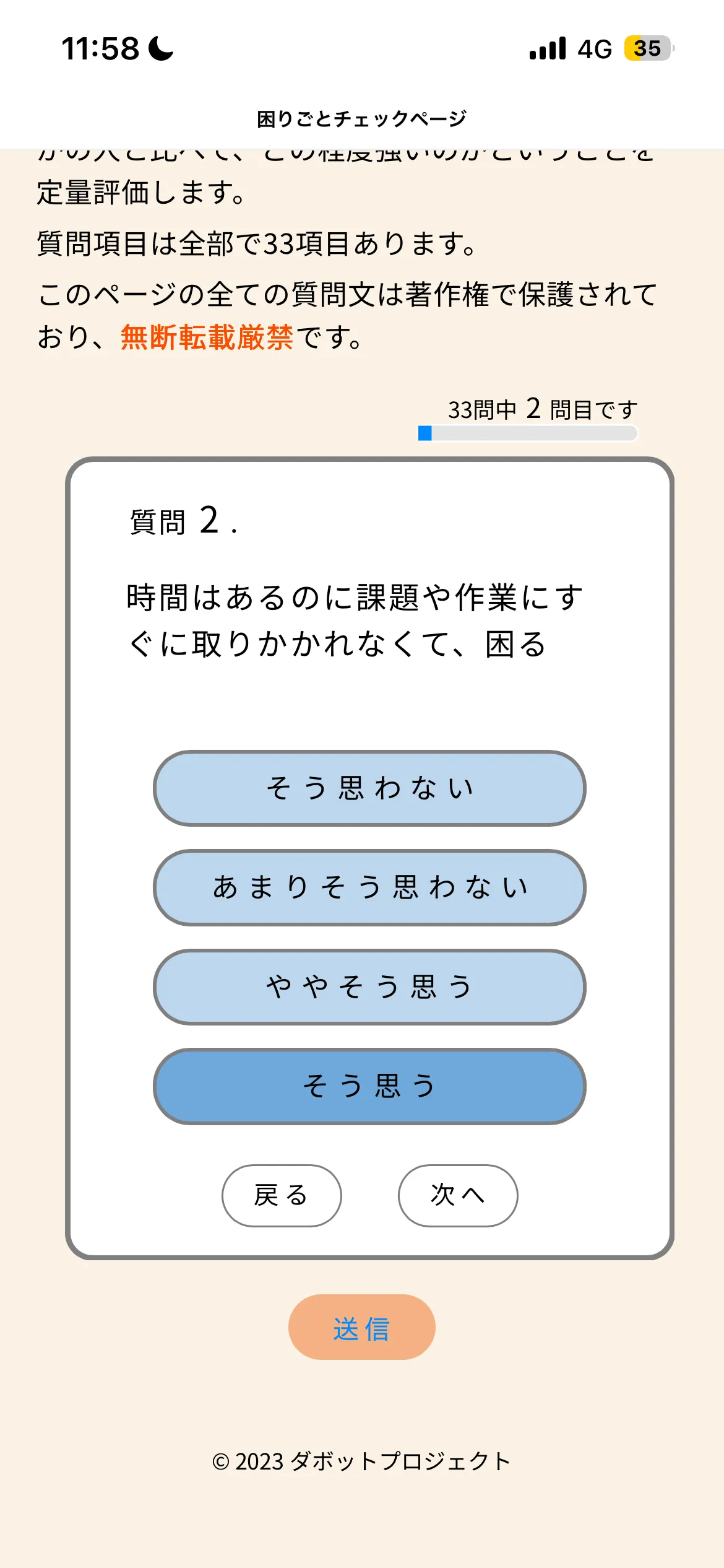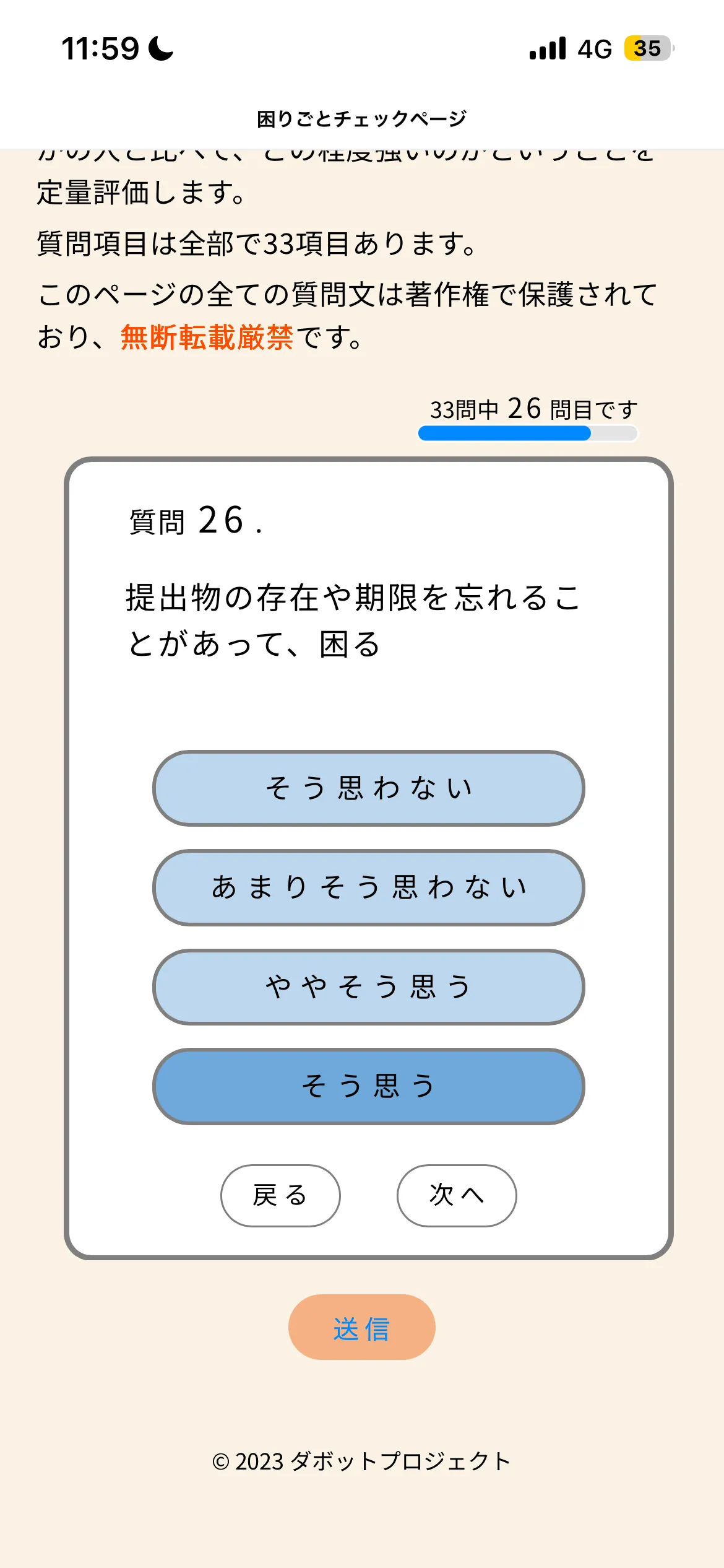 すべての質問に回答し終えたら、画面下部に表示されている「送信」ボタンをタップしてください。