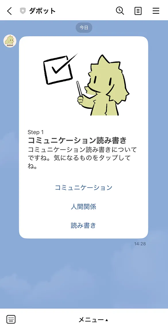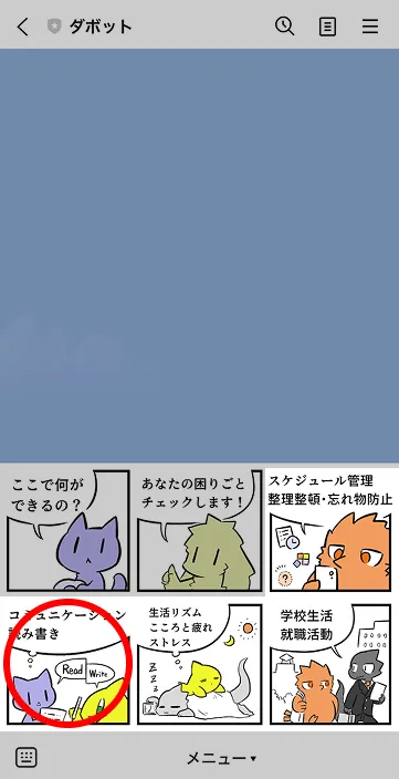 「スケジュール管理/整理整頓・忘れ物防止」「コミュニケーション/読み書き」「生活リズム/こころと疲れ/ストレス」「学生生活/就職活動」のメニューのうち、気になる項目をタップしてください。