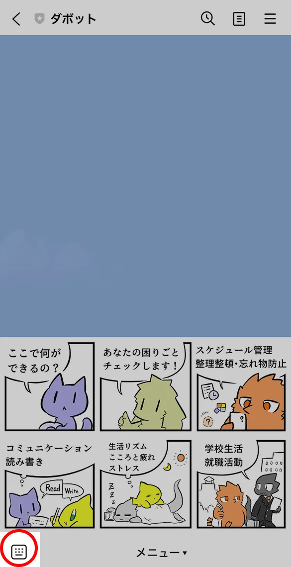 困りごとに関する自由なキーワードを入力して、対処法を検索することもできます。メニューが表示されている場合は、左下のアイコンからキーボードを表示してください(キーボードを表示する方法は、機種によって異なる場合があります)。